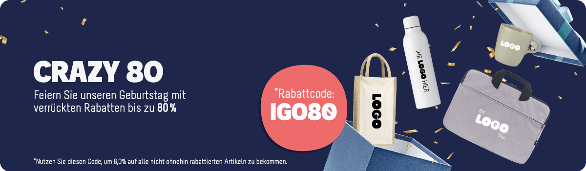 Seit 80 Jahren unterstützen wir Unternehmen und Organisationen dabei, ihre Marken mit bedruckten Werbeartikeln zum Strahlen zu bringen. Und zu unserem Jubiläum beschenken wir Sie mit besonderen Crazy 80-Rabatten von bis zu 80%! Online warten exklusive Angebote auf Ihre Marke. Ihr Lieblingsartikel ist nicht dabei? Kein Problem! Mit dem Rabattcode IGO80 erhalten Sie 8,0 % Jubiläumsrabatt auf alle Artikel, die nicht bereits im Angebot sind.