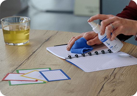 Das Schreiben auf unseren Seiten fühlt sich an wie das Schreiben auf normalem Papier und die Notizen trocknen innerhalb von Sekunden. Zum Löschen kann man die Rückseite des Stifts, das mitgelieferte Löschtuch, den Reinigungsschwamm, das Reinigungsspray oder ein trockenes/feuchtes Tuch verwenden.